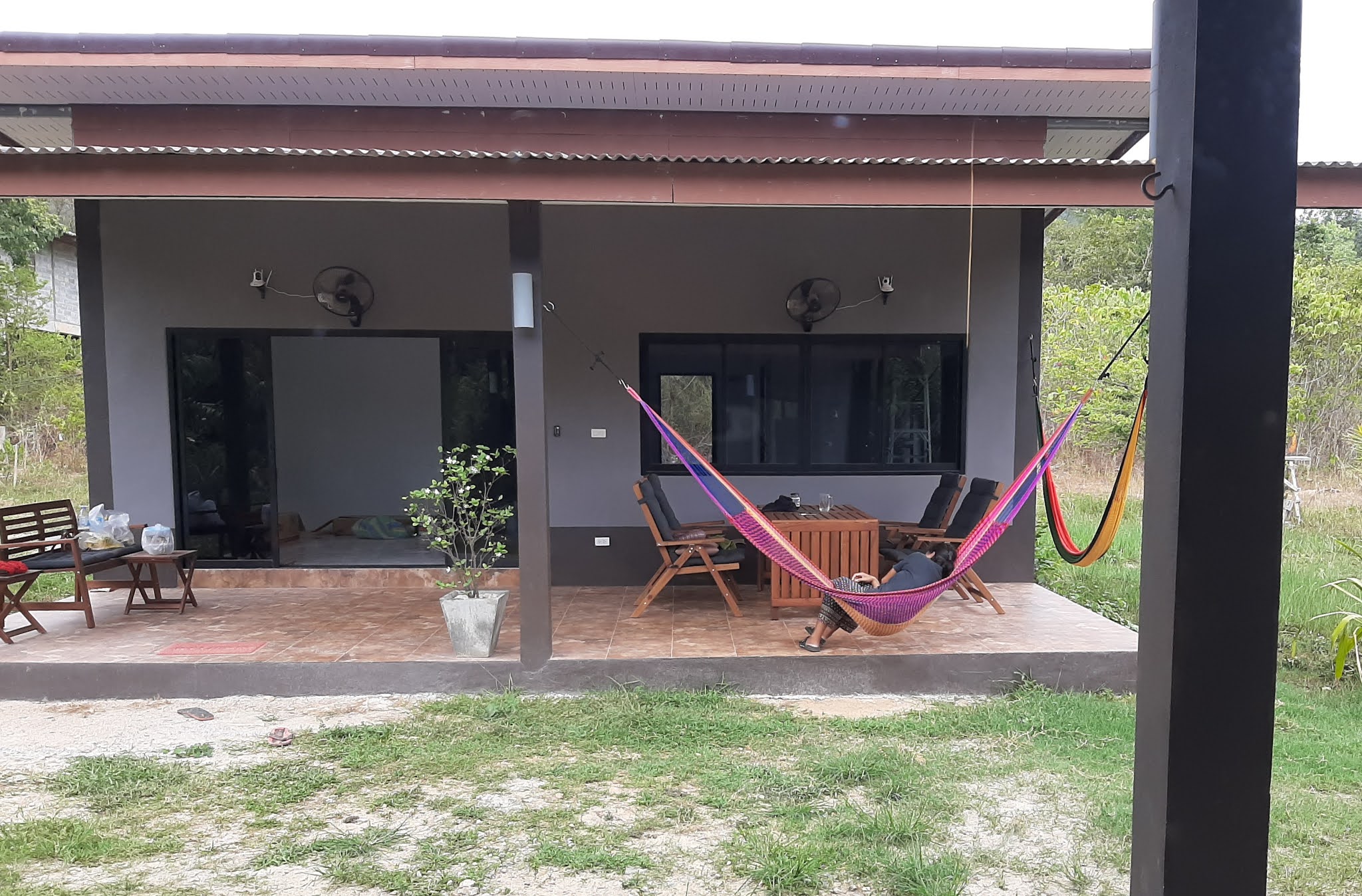 Tätä kirjoittaessa paapan vaimo on ajanut pihaan eväspakettien kanssa ja molemmat istuivat ensin terassilla lounaalla kunnes ukko sytytti taas pesäpallomailan kokoisen sätkänsä ja painui takaisin hommiin. Sillä aikaa vaimo asettautui riippumattoomme päikkäreille.